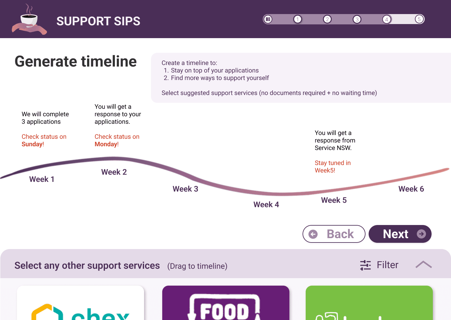In busy areas, users can quickly select which areas of support they would like help with. Keeping in mind our users would have limited time in busy areas, a digital booklet will be generated for users to keep reference of the different schemes (Government and non-Government) they can apply to when they have time.