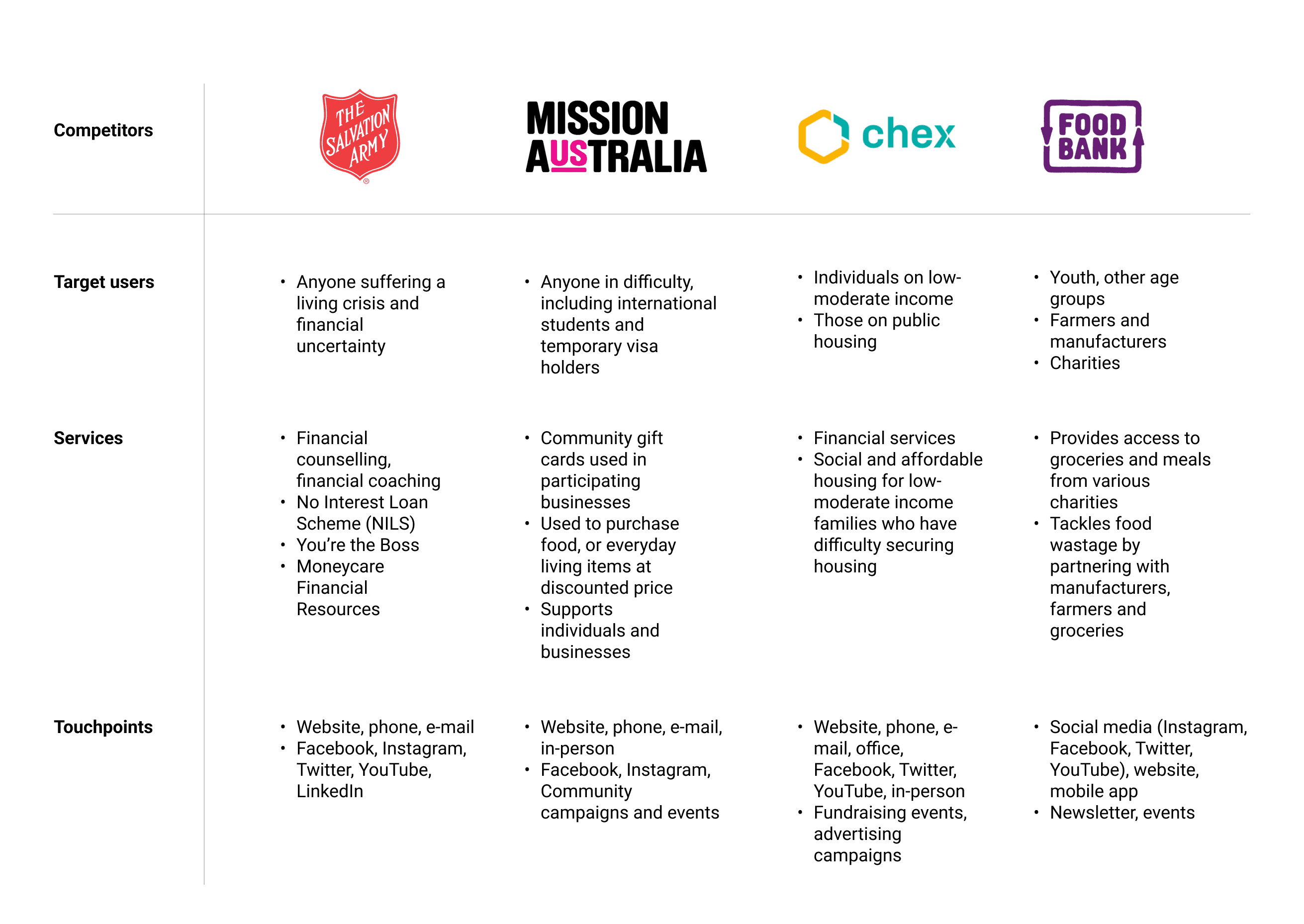 All of our users were aware of Government schemes, most notably, Youth Allowance provided by Centrelink. However, many were unaware of less well-known schemes provided by NGOs or charities. Awareness of support services are spread through word of mouth from friends.