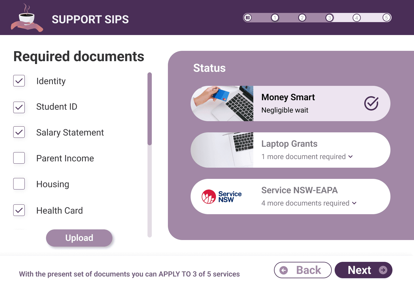 Users can register to see what services they are eligible for and apply for multiple services on a one-time basis. These would be placed in university campuses, increasing students' awarenesses.