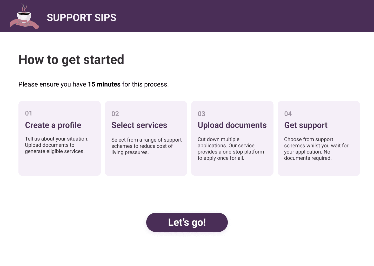 After 3 rounds of ideation workshops and narrowing down our scope using a decision matrix, Support Sips was developed to address the pain points, creating a centralised and streamlined experience for busy university students to find, manage and track applications for support schemes.